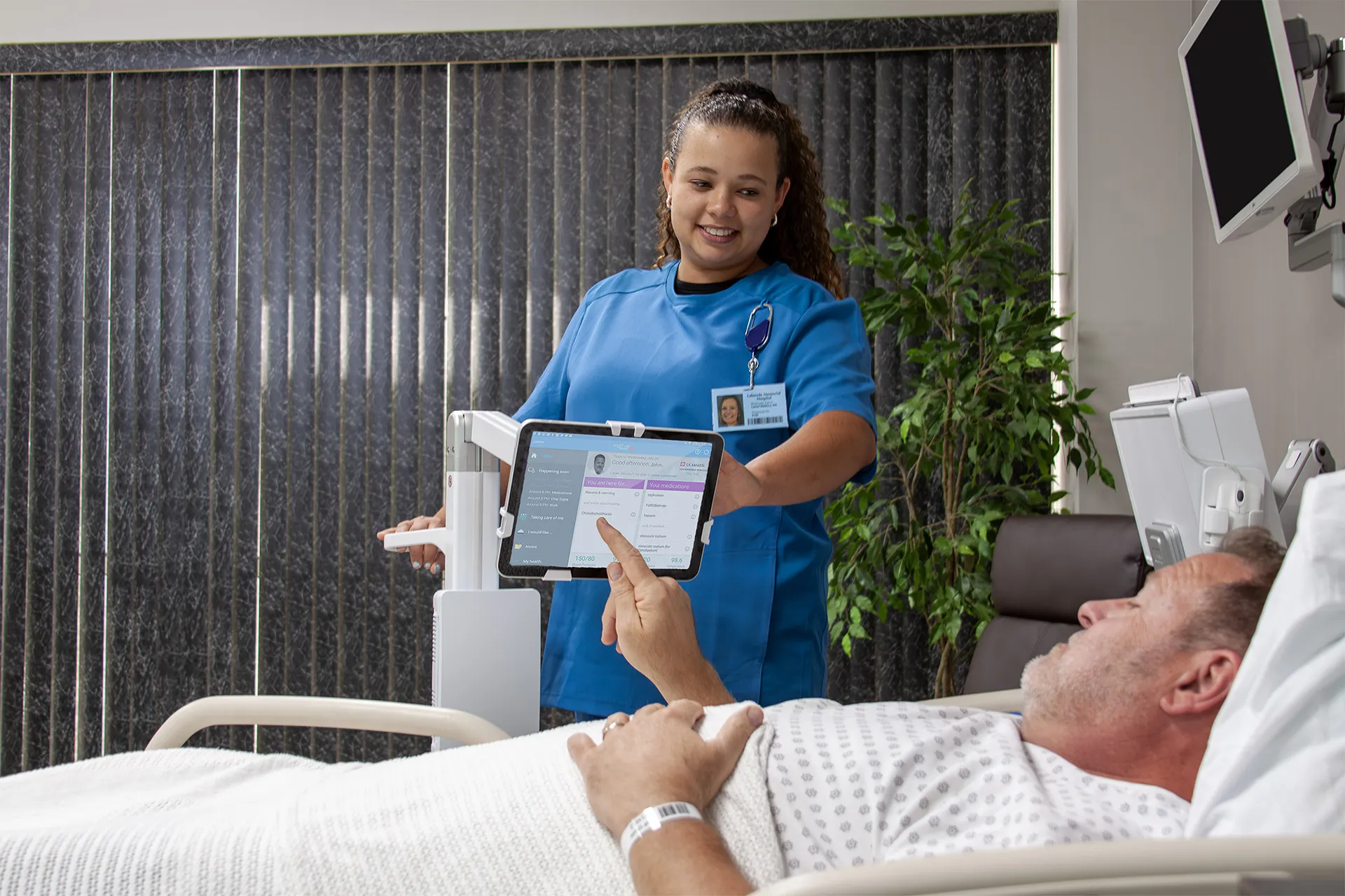 The NEW Tryten P1 Tablet Cart is a versatile solution tailored to the needs of modern healthcare environments. The P1 features a long 14″ articulating arm, a sturdy base, and larger column size for mounting accessories and clean cable management. Designed for comfortable use and easy mobility, the P1 minimizes strain and fatigue for clinicians and a sleek profile makes it ideal for tight spaces.