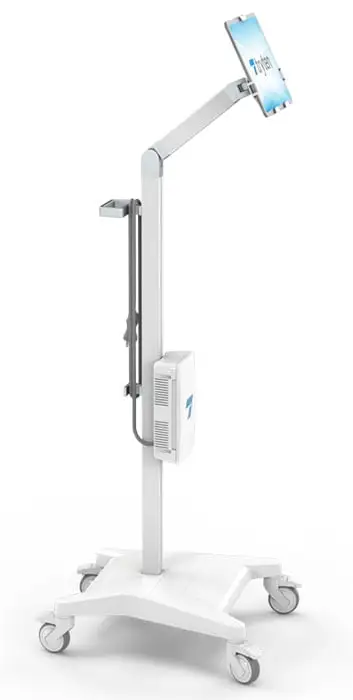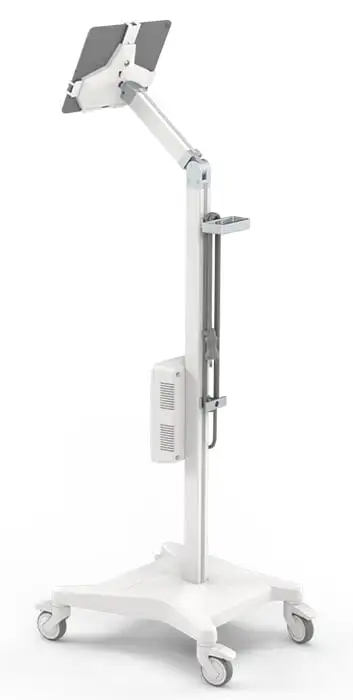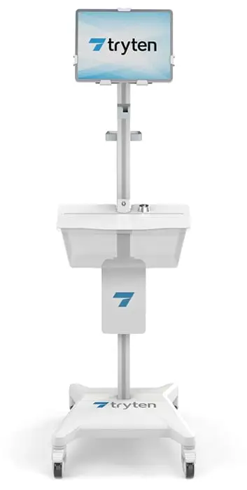 Key features include a 360-degree rotating and locking OmniTab mount, an articulating arm, a weighted base and lockable wheels. This medical cart is compatible with over 40 Tryten accessories and can hold various devices. Its ergonomic design helps reduce healthcare worker fatigue so they can work comfortably for extended periods.